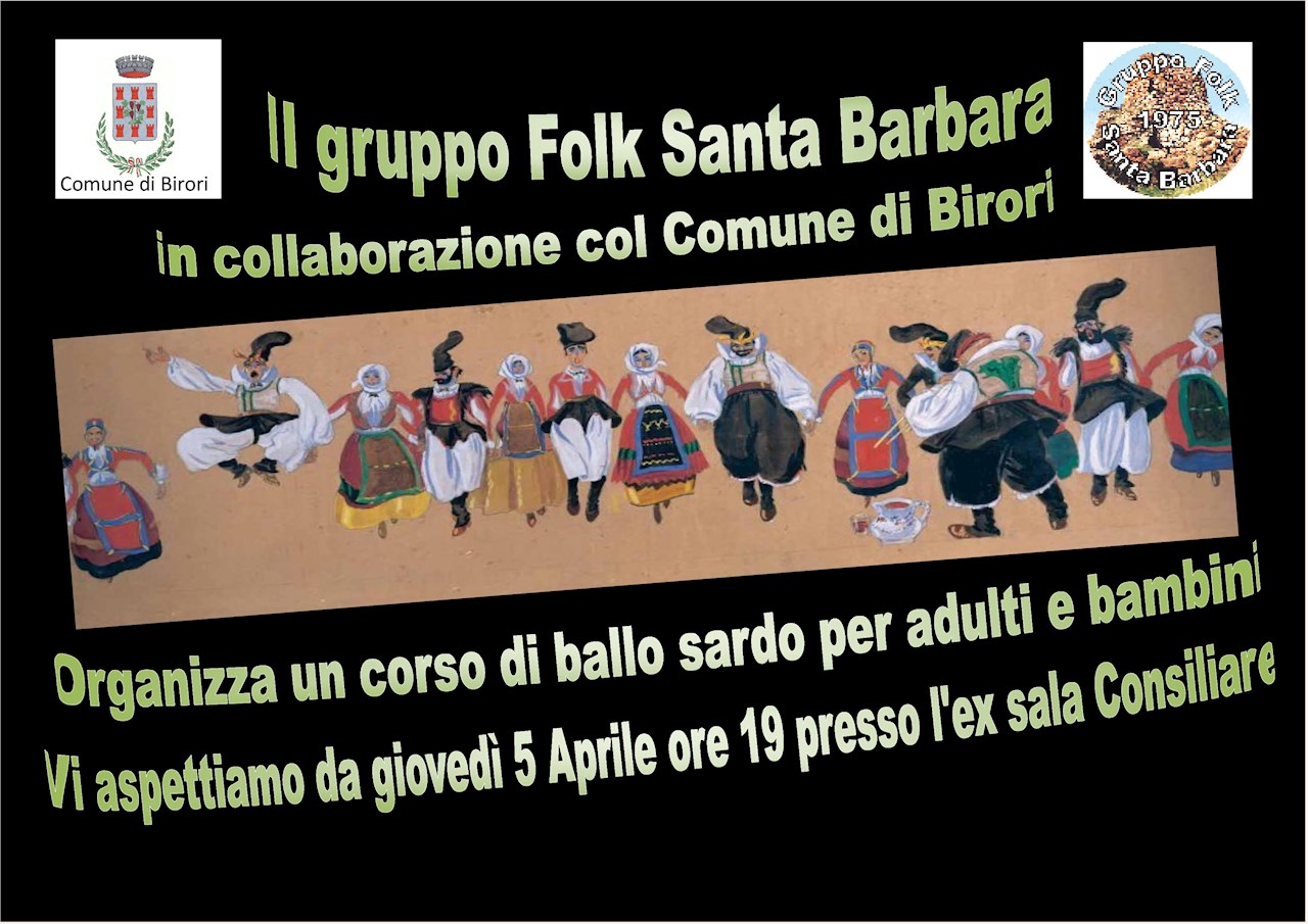 Giovedì 5 aprile 2018 dalle ore 1900, presso i locali della ex sala consiliare siti in via S. Andrea al n° 16, avrà avvio il corso di ballo sardo per adulti e bambini, curato dall'Associazione Culturale Gruppo Folk Santa Barbara con la collaborazione del Comune di Birori.