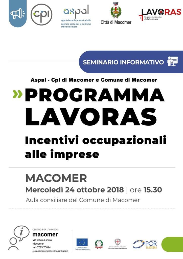 Mercoledì 24 ottobre 2018, alle ore 15:30, presso l'aula consiliare del Comune di Macomer, si terrà un seminario informativo sui contenuti del programma a cura dell'ASPAL - Centro per l'impiego di Macomer.
