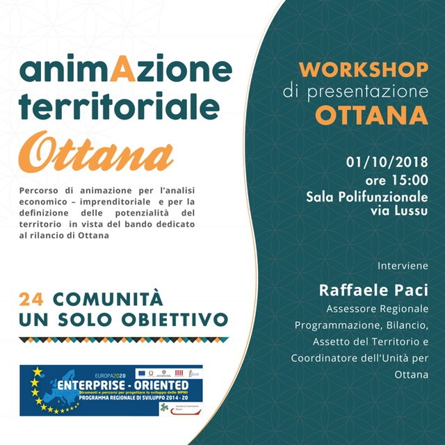 Lunedì 1 ottobre 2018, ore 1500, presso la sala polifunzionale in via Lussu ad Ottana (Nu), si terrà il workshop di presentazione del percorso di animazione "24 Comunità un solo obiettivo" per l'analisi economico-imprenditoriale e per la definizione delle potenzialità del territorio in vista del bando dedicato al rilancio di Ottana.
